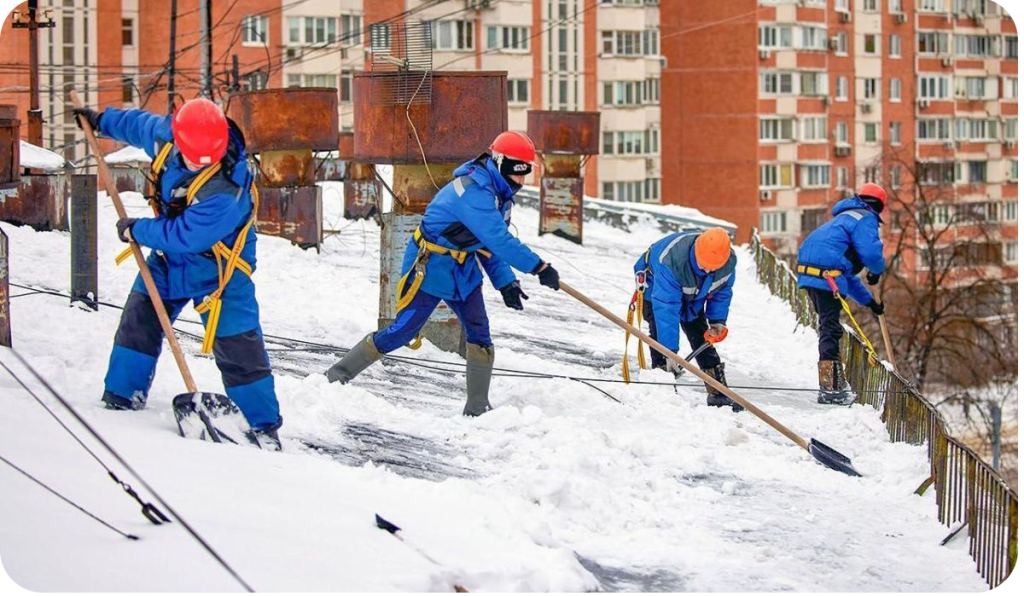 - Периодическую очистку крыши с наружным водоотводом от снега (не допуская накопление снега слоем более 30 см; при оттепелях снег следует сбрасывать при меньшей толщине).